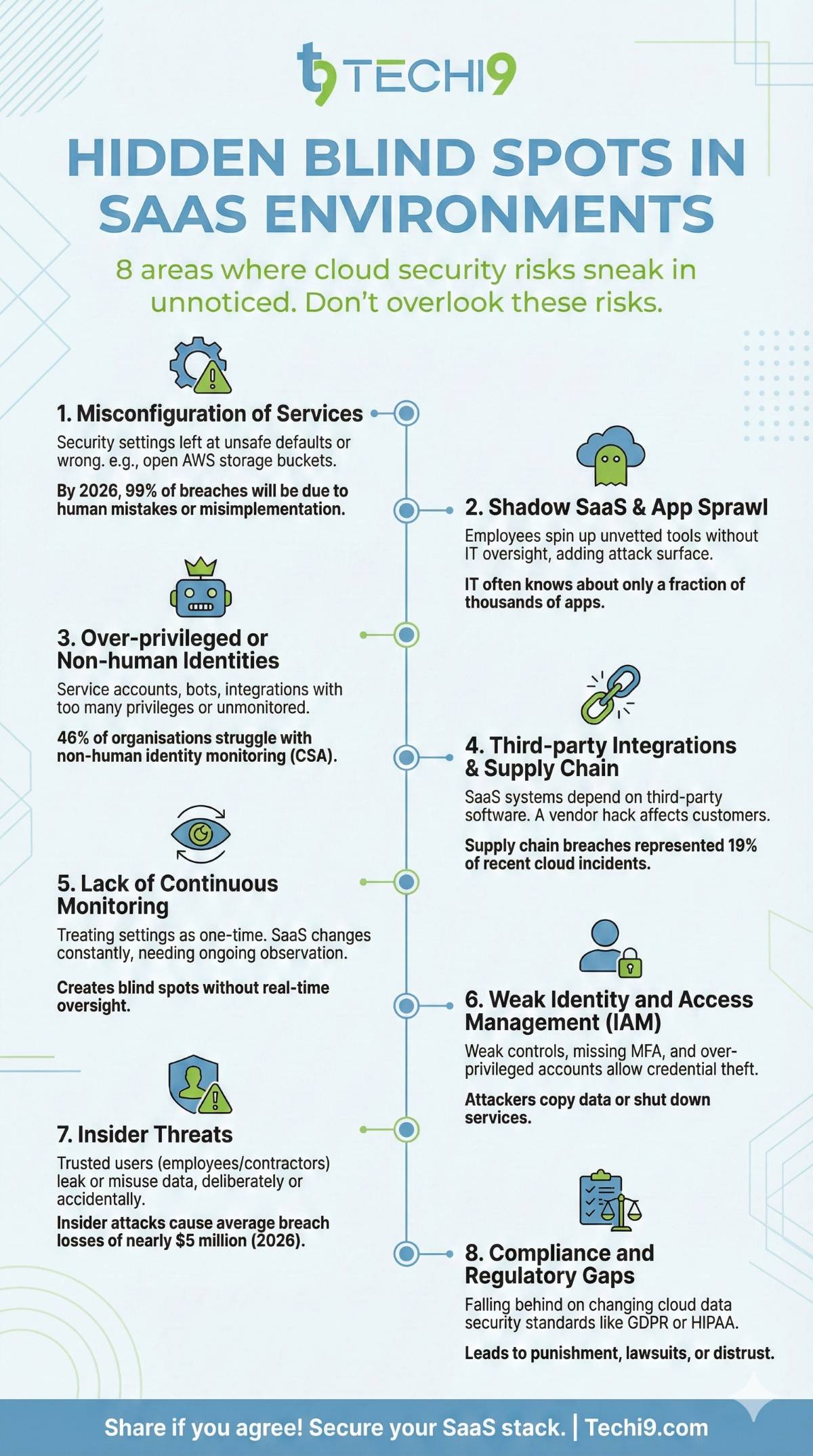 Many SaaS platforms have service-accounts, bots, integrations. If these identities have too many privileges or are unmonitored, they become a blind spot. The CSA found 46% of organisations struggle with non-human identity monitoring.