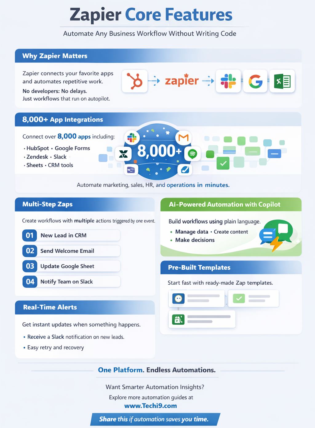 - AI-powered Automation: Copilot has been introduced in Zapier, which provides the ability to create workflows using plain language with the assistance of AI. The Zaps also enable you to manage data, create content, and make decisions based on the steps provided by the AI in your Zaps.